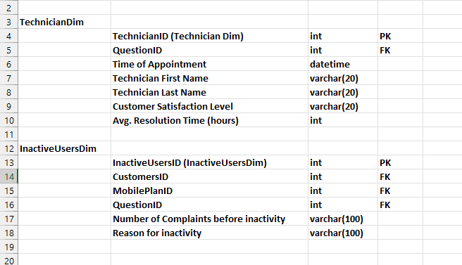 Solving this task was one of the most difficult parts of the entire project. These tables have to connect with either the fact table or one of the dimensions table in the database schema. I had to set up a new meeting with the client in order to ask questions and generate new ideas. After a lot of brain-racking, I was able to come up with two tables: The TechnicianDim table and the InactiveUsersDim table. The TechnicialDim table was able to discuss creating records for the Technicians sent by the company to fix customer complaints that require physical attention while the InactiveUsersDim Table contained the records of customers who have stopped using the company services and the reasons why they stopped.