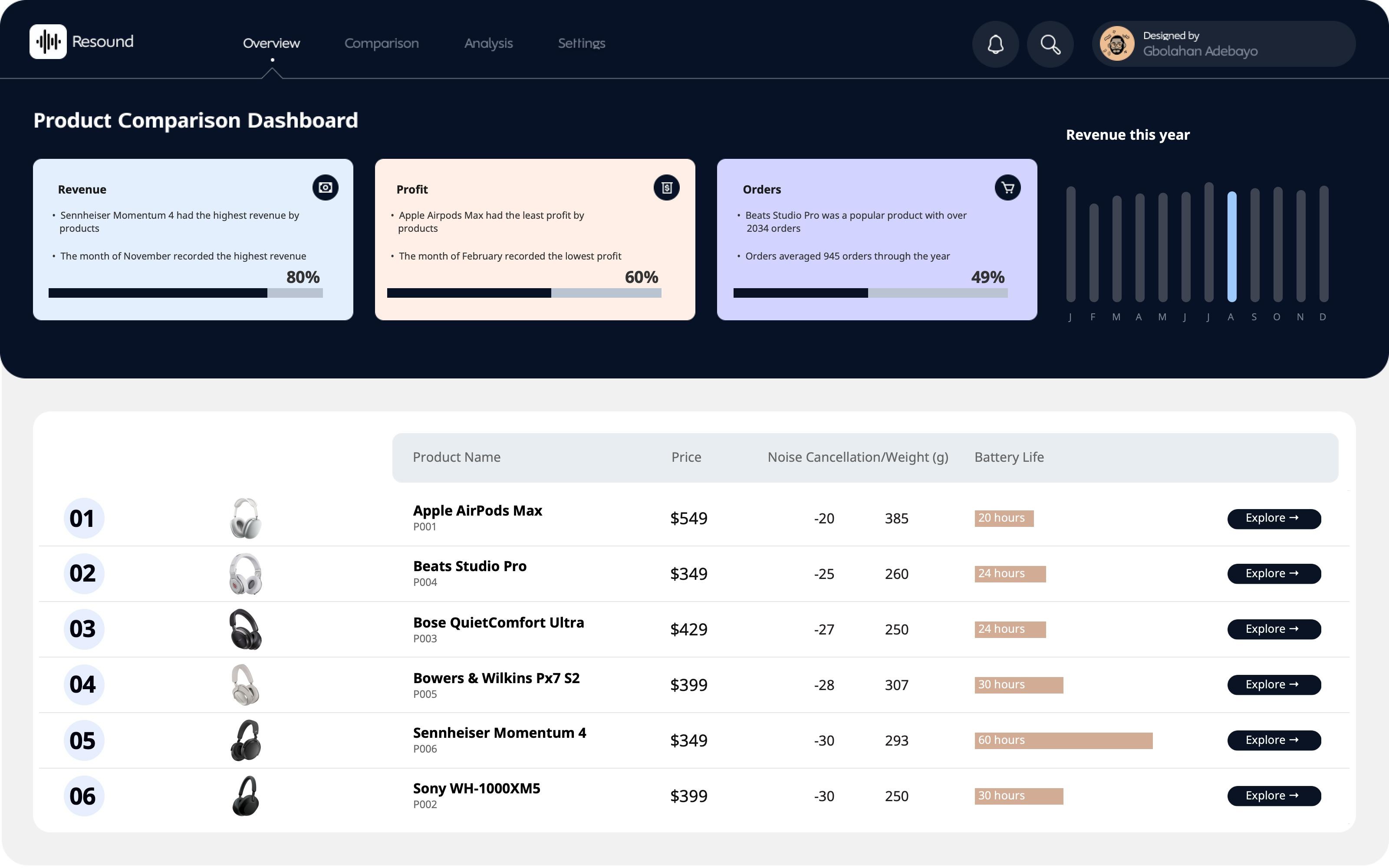 The system tracks complete product performance data across six headphone models: Apple AirPods Max, Beats Studio Pro, Bose QuietComfort Ultra, Bowers & Wilkins Px7 S2, Sennheiser Momentum 4, and Sony WH-1000XM5. Each product record includes pricing, technical specifications (noise cancellation rating, weight, battery life), monthly sales metrics (profit, revenue, orders, buyers), return status counts, geographic distribution across US states, and individual transaction details with order IDs, dates, quantities, and profitability. The primary requirement was building a comparative analytics tool where teams could evaluate product performance side by side, track monthly KPI trends, identify top-performing products by different metrics, and drill down into transaction-level details without manual data aggregation.