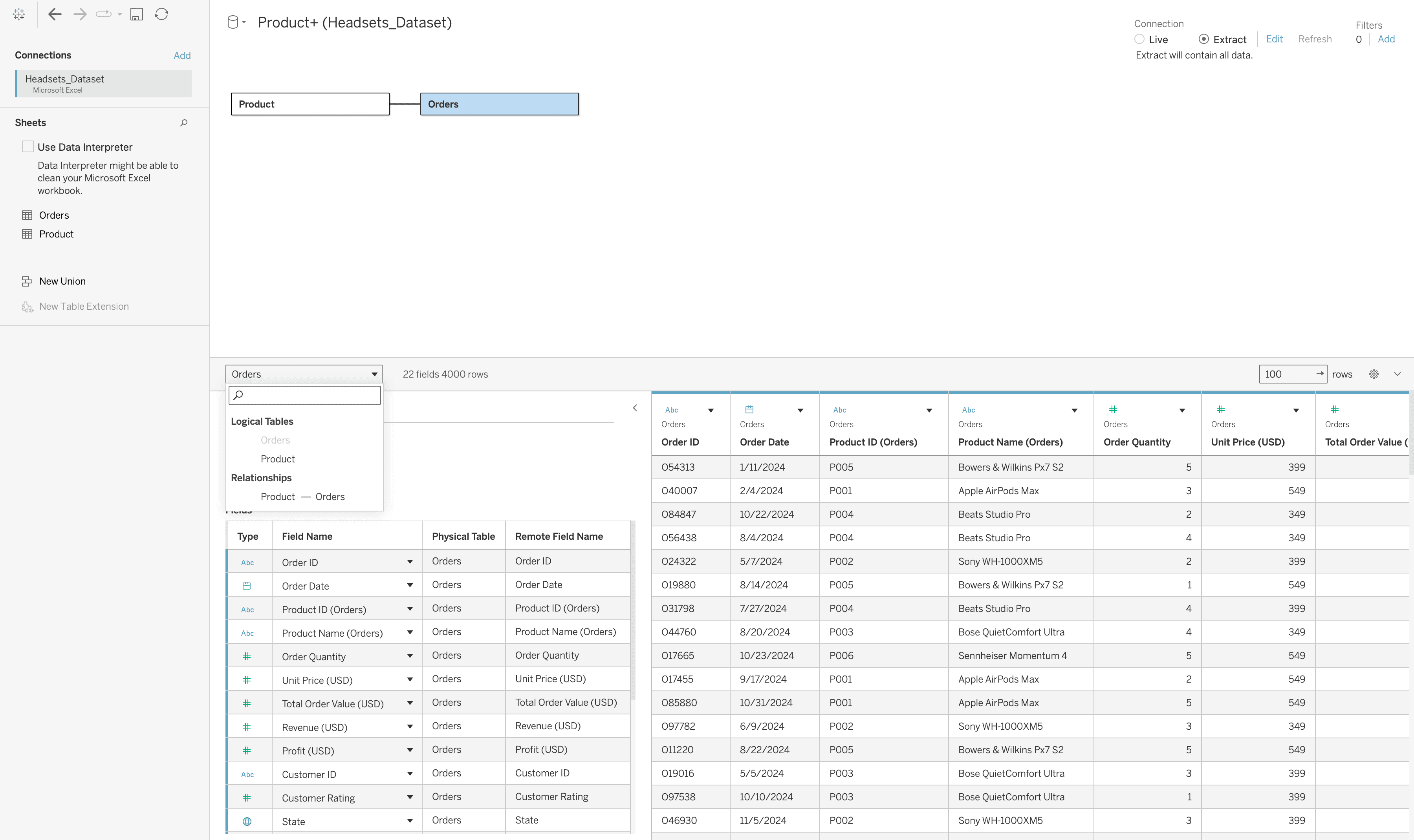 The Product Comparison Dashboard delivers comprehensive performance analytics across six premium headphone products, enabling sales and product teams to understand revenue drivers, profitability patterns, and customer behavior. Designed for retail managers and e-commerce analysts, this dual-view dashboard answers critical business questions: Which products generate the most revenue and profit? How do products compare in order volume and customer distribution? What are the geographic sales patterns and transaction trends? By consolidating product performance metrics, monthly trends, and transaction-level data into one interactive interface, the dashboard eliminates the need to compile multiple reports or query databases for competitive product insights.