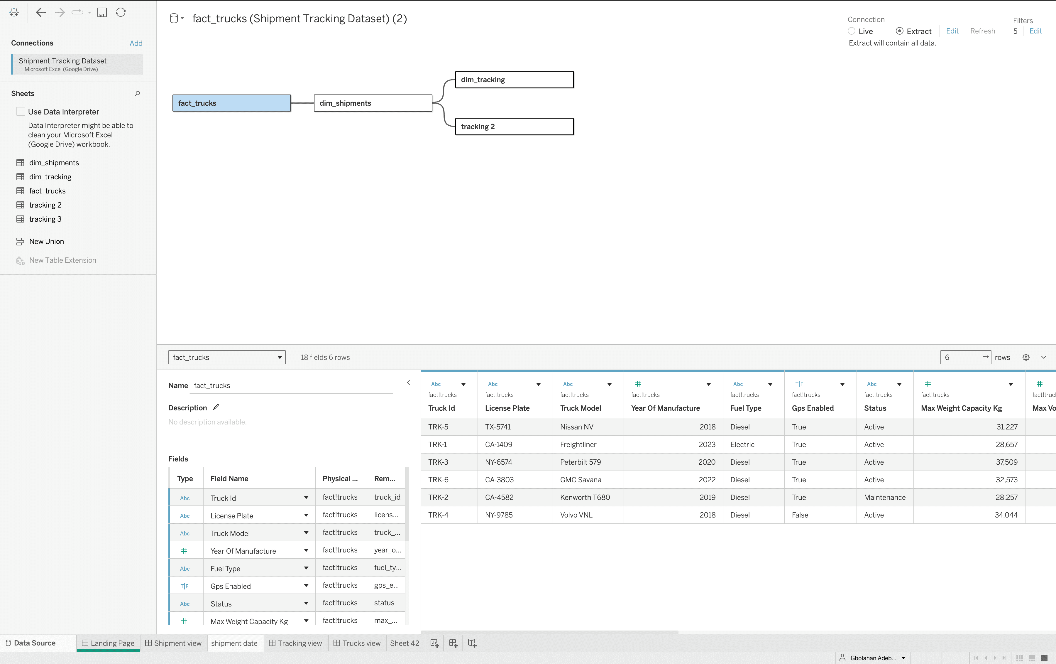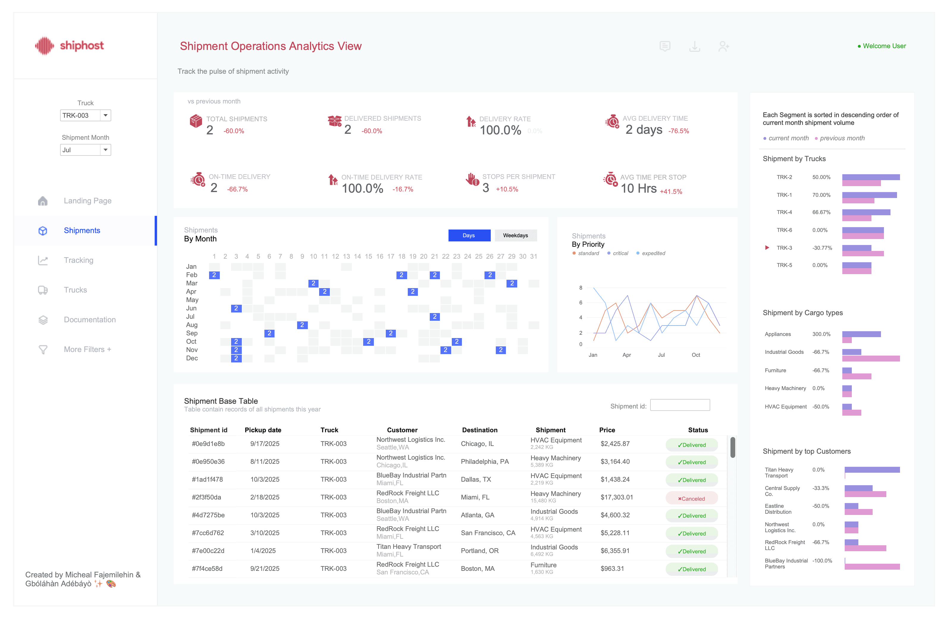 The Shipment Tracking Dashboard provides end-to-end visibility into logistics operations across shipments, trucks, and delivery routes. Designed for operations managers and logistics coordinators, this multi-view dashboard answers critical questions: Where are shipments right now? Which trucks are performing efficiently? What are our on-time delivery rates? By consolidating shipment data, truck fleet information, and route tracking into one unified interface, the dashboard eliminates the need to check multiple systems or spreadsheets for operational insights.